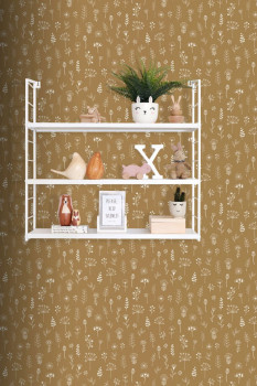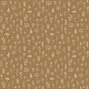 Dunkelocker Vliestapete für die Wand, weißes Muster aus Blumen und Pflanzen.