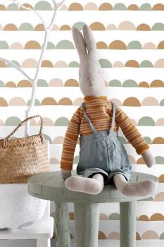 Vliestapete weiß, Halbkugelmuster in Braun-, Rosa- und Grüntönen.