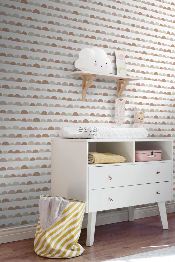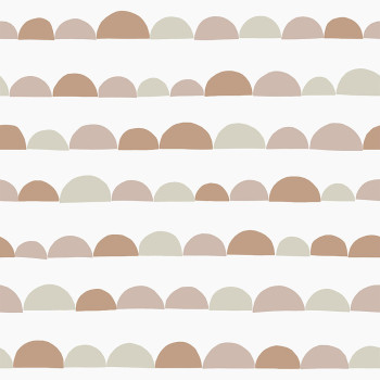 Vliestapete weiß, Halbkugelmuster in Braun-, Grau- und Altrosatönen.
