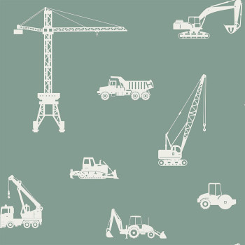Vliestapete grün, Tapete für Jungen - Autos, Bagger, Kräne und Traktoren.
