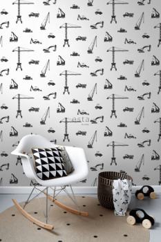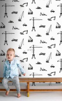Schwarz-weiße Vliestapete für Jungen, Tapete mit Baggern, Traktoren und Kränen.