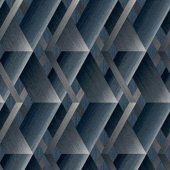 Geometrische 3D-Vliestapete in Holzoptik, Blau- und Grautöne.