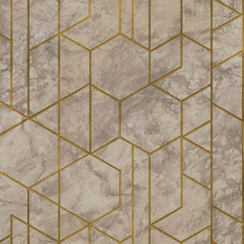 Braun-beige geometrische Vliestapete, metallische Goldlinien.