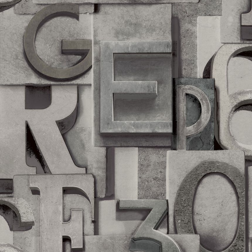 Grau-schwarze Vliestapete, Buchstaben und Zahlen mit 3D-Effekt.