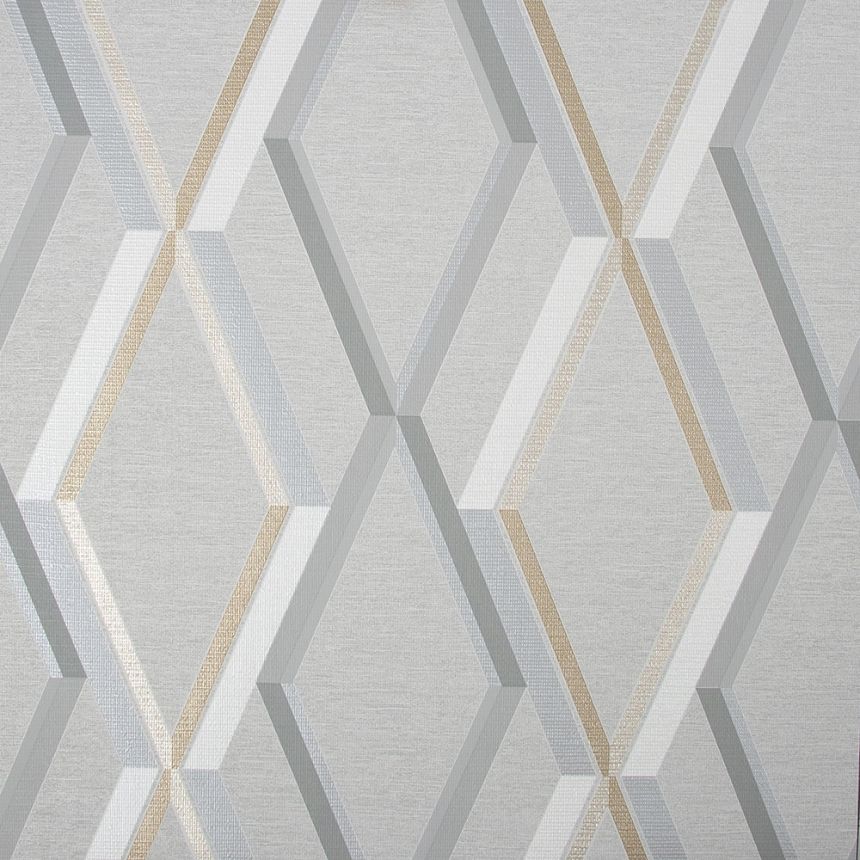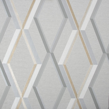 Vliestapete in Grautönen, kombiniert mit einem goldenen Metallic-Streifen, mit geometrischem Muster.