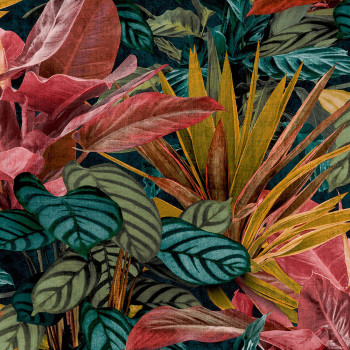 Vliestapete, ein Muster aus tropischen Blättern in Grün-, Türkis-, Pink- und Ockertönen. Die Tapete hat eine textile Struktur.
