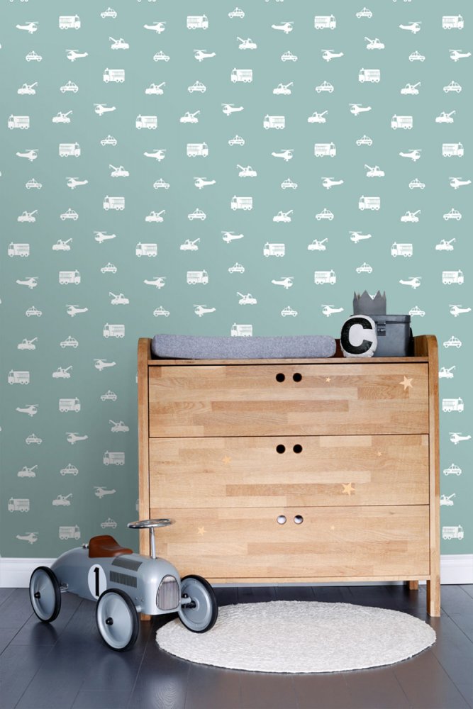 Türkisfarbene Vliestapete für die Wand, Tapete für Jungen mit Autos, Kränen und Hubschraubern.