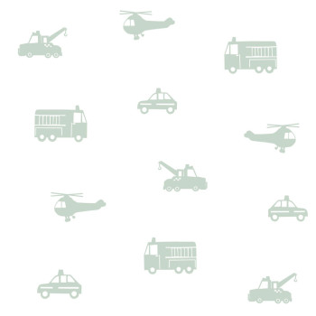 Vliestapete für Jungen, grüne Autos, Hubschrauber auf weißem Hintergrund.