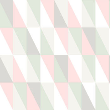 Geometrische Vliestapete für die Wand, Dreiecke in Pastellrosa, Grün, Grau und Weiß.
