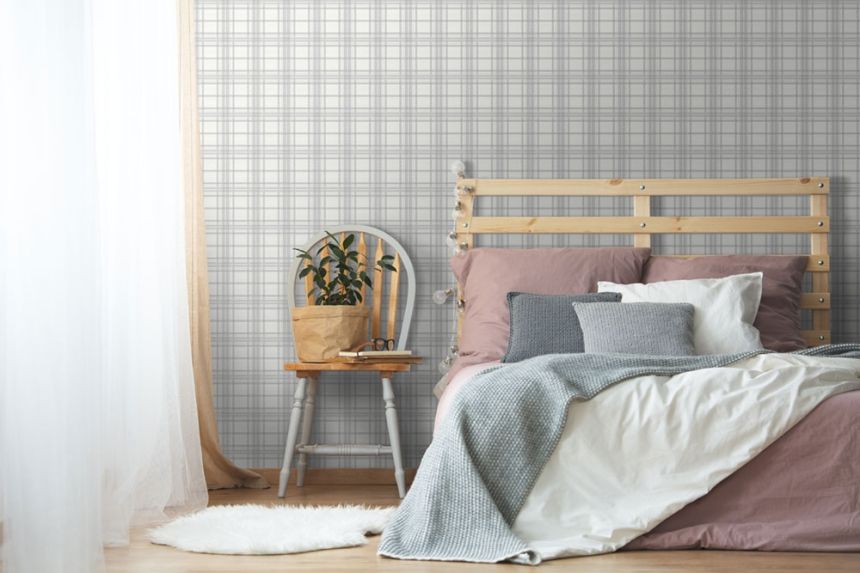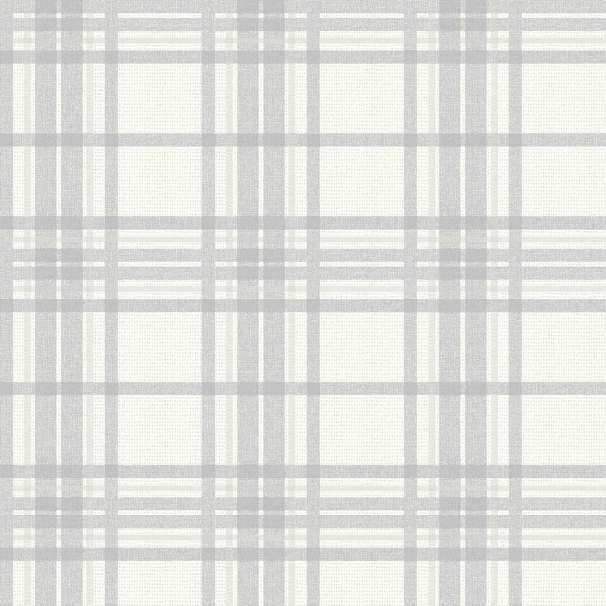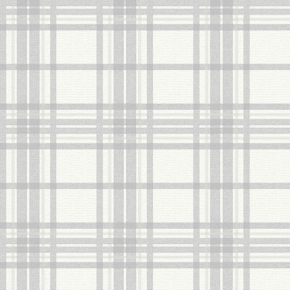 Vliestapete für die Wand. Muster und Struktur Tartanstoff - Grautöne, metallisch glänzender Silberstreifen.