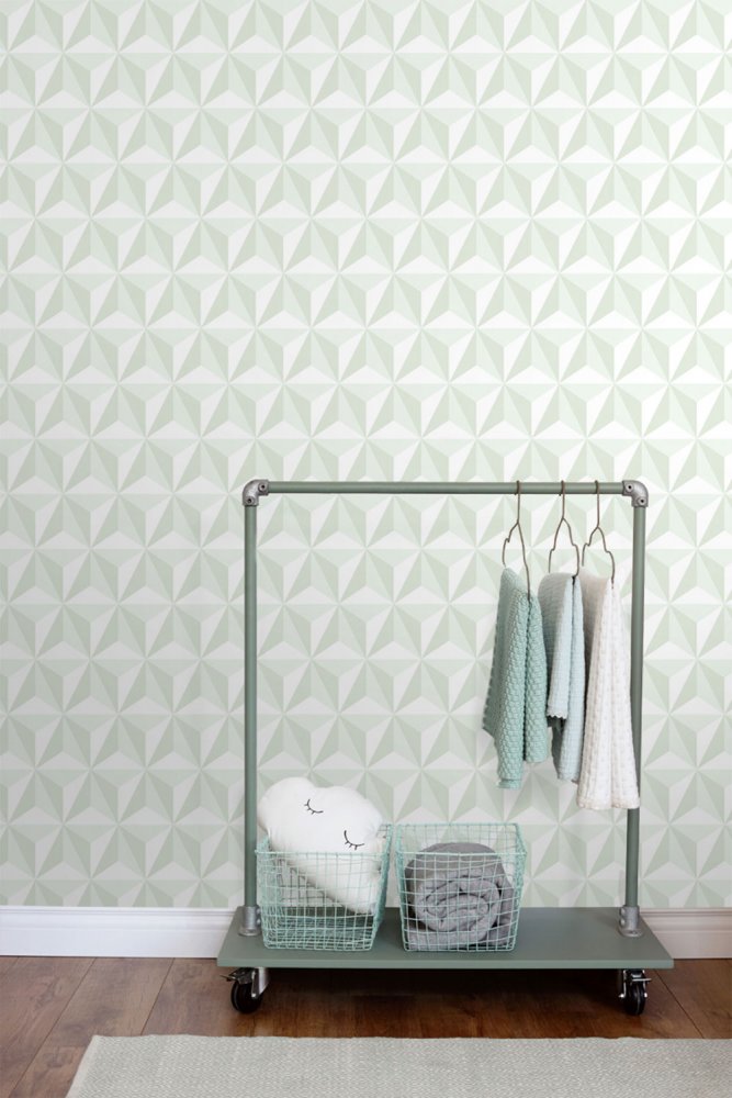 3D-Vliestapete an der Wand, grün-weißes Sternenmuster.