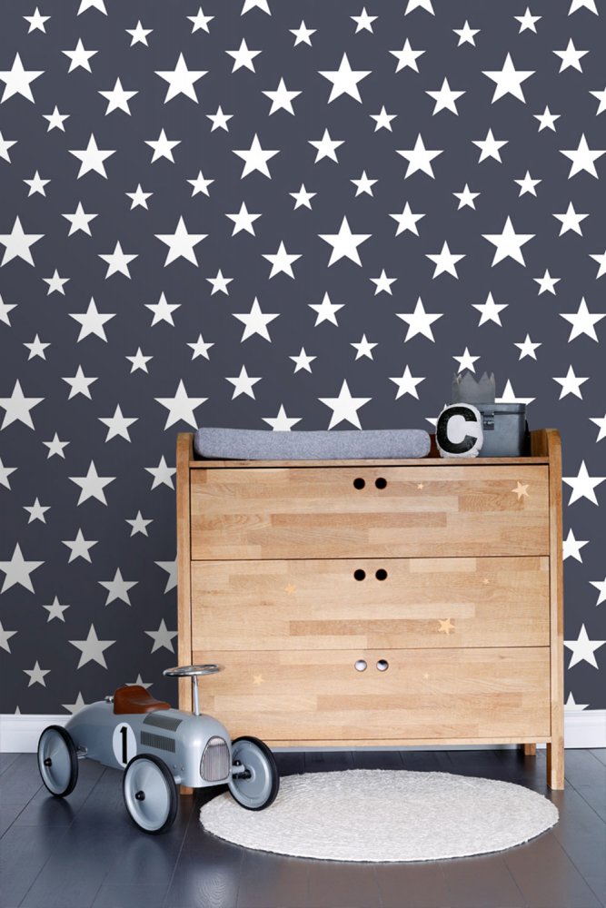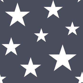 Dunkelblaue Vliestapete für die Wand, Muster aus weißen Sternen.