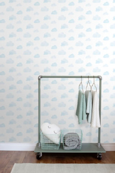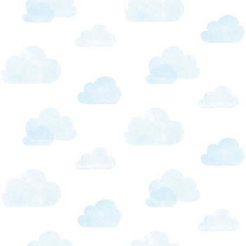 Vlies Kindertapete für die Wand, hellblaue Wolken auf weißem Hintergrund.
