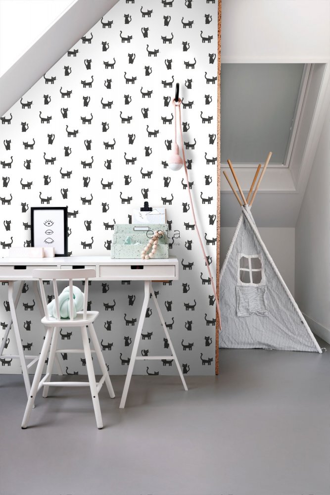 Weiße Vliestapete für die Wand, schwarze Katzen, Kätzchen.