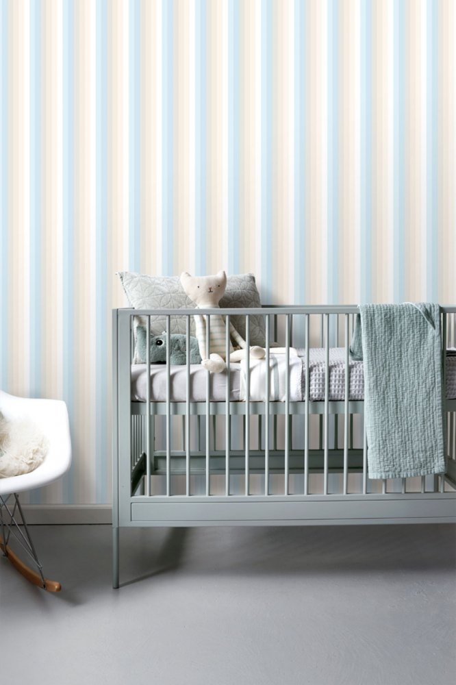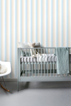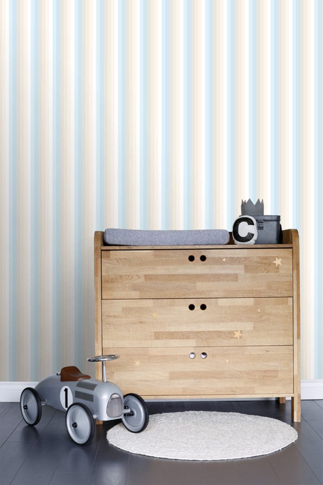 Vliestapete Streifen in Blau, Weiß, Grau und Creme.