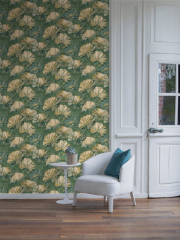 Romantische Vliestapete, Seerosenblüten auf grünem Hintergrund.