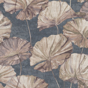 Romantische Vliestapete, Seerosenblüten auf blauem Hintergrund. Blüten in Burgunder-, Ocker- und Pinktönen.
