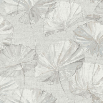 Vliestapete mit romantischem Motiv aus Seerosenblüten. Tapete in Grautönen, Graublau, einem Hauch Ocker.