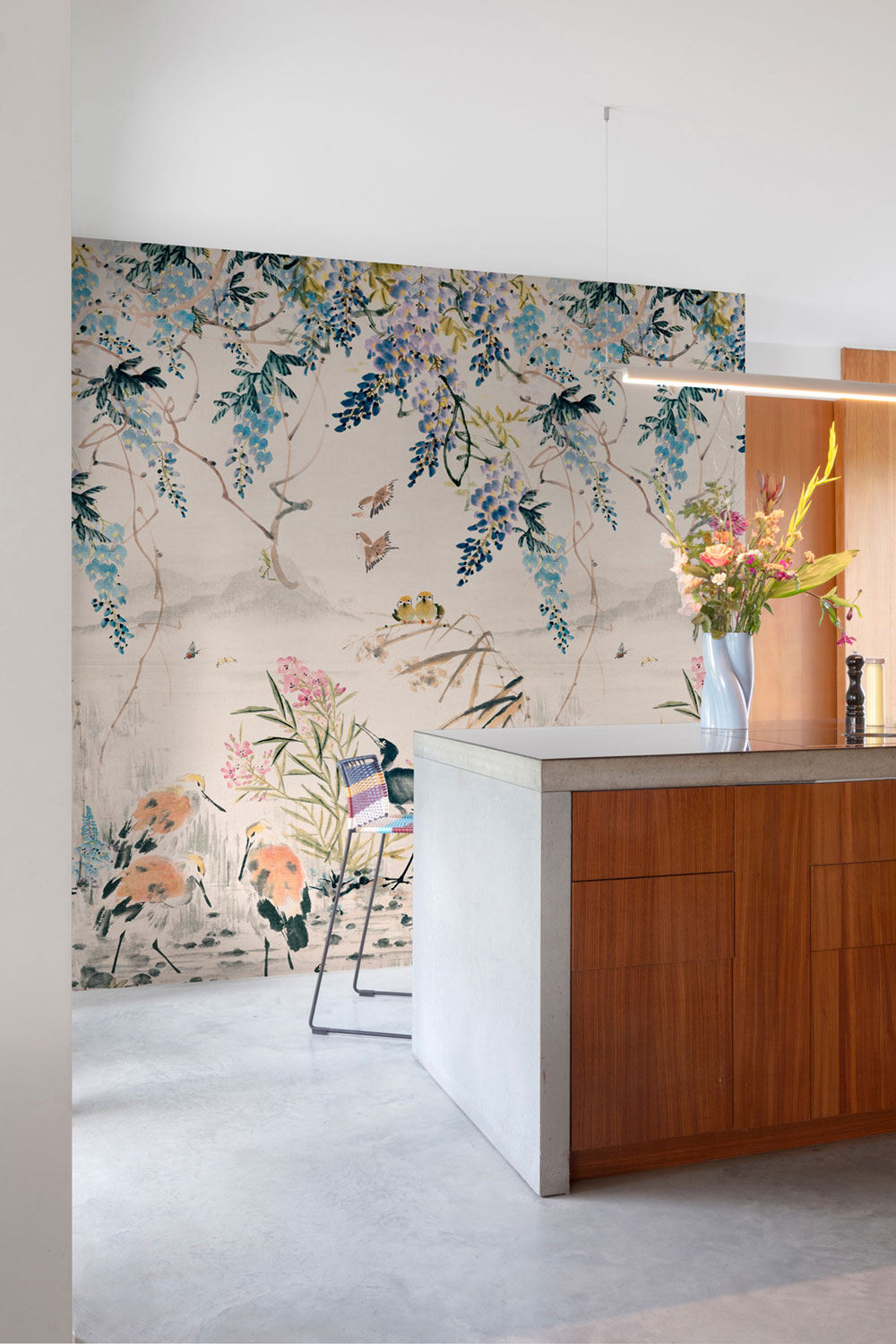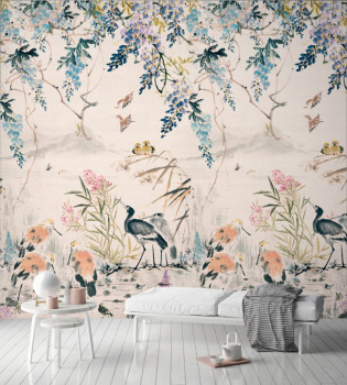 Vlies-Bildtapete mit wunderschönem Motiv von Wasservögeln und kleinen Vögeln im blühenden japanischen Garten.