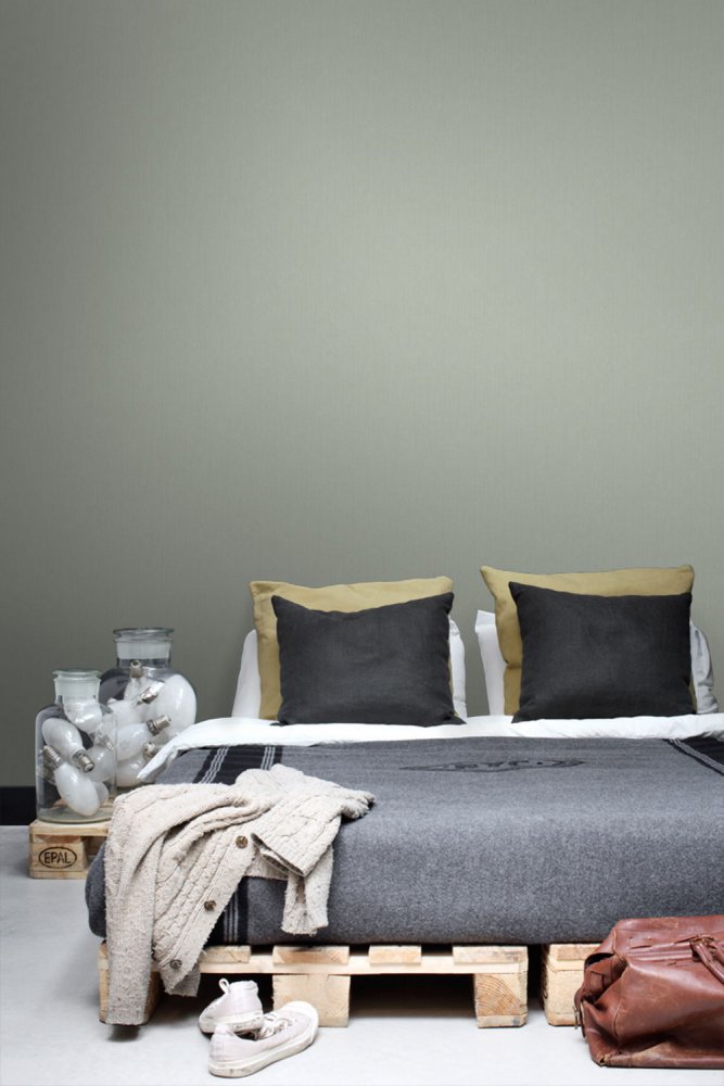 Strukturtapete, Imitation von grau-grünem Stoff.