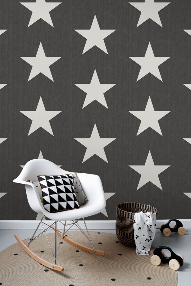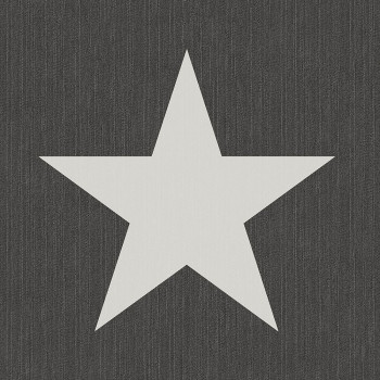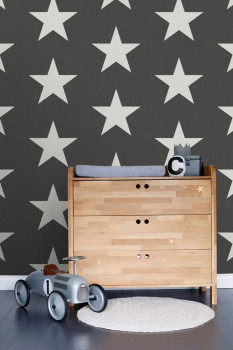 Schwarze Vliestapete, Stoffimitat, Motiv graue Sterne.