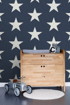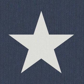Blaue Vliestapete, Stoffimitat, Motiv graue Sterne.