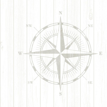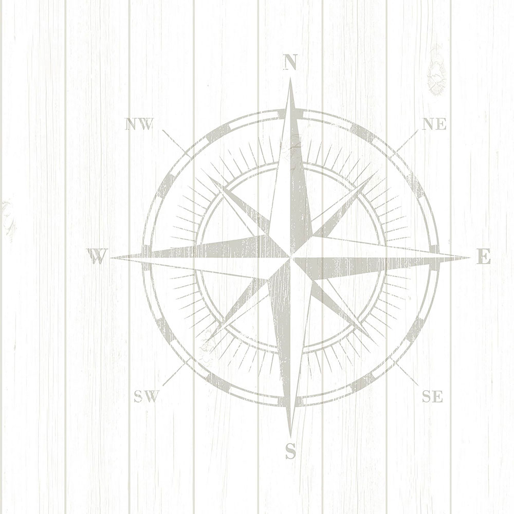 Graue und weiße Vliestapete mit Kompass auf Holzdielen.