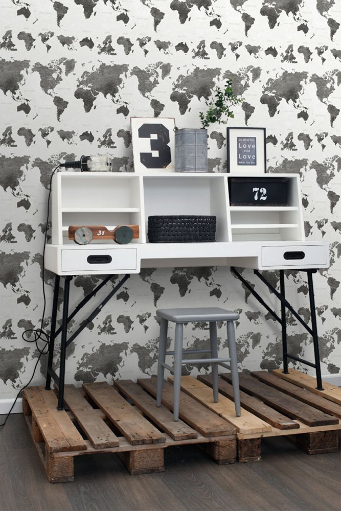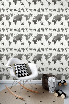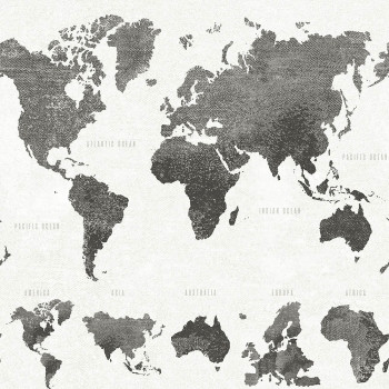 Tapete Weltkarte in Grau- und Schwarztönen.