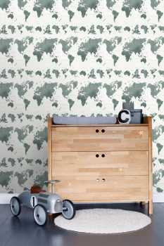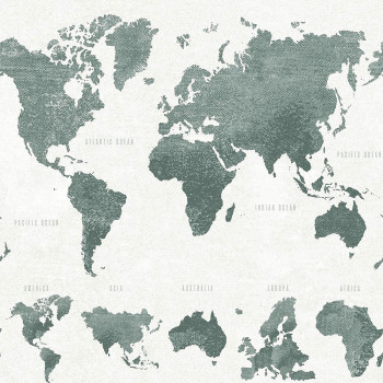 Tapete Weltkarte in Grau- und Graugrüntönen.
