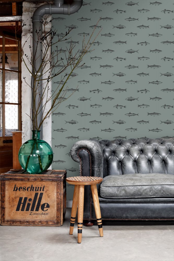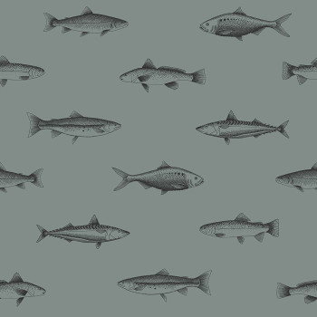 Blaugrüne Vliestapete mit schwarzen Fischen 128874, Regatta Crew, Esta Home