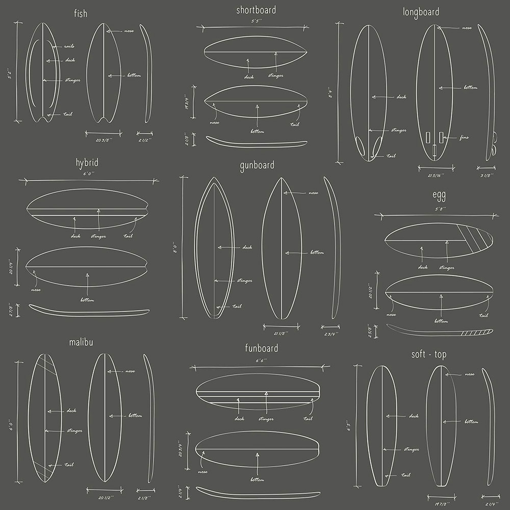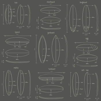 Schwarze Vliestapete, weiße Skizzen von Surfbrettern.
