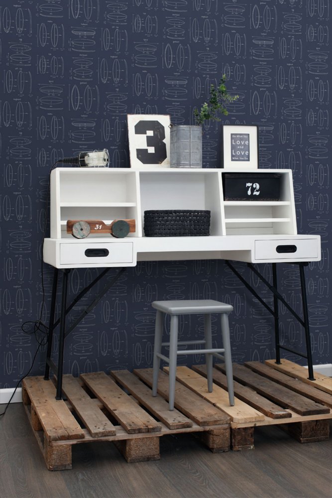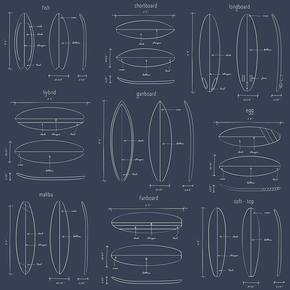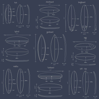 Dunkelblaue Vliestapete, weiße Skizzen von Surfbrettern.