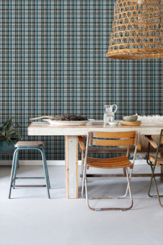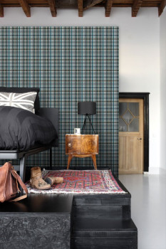 Vliestapete, kariertes Muster in Grün-, Grau- und Schwarztönen.