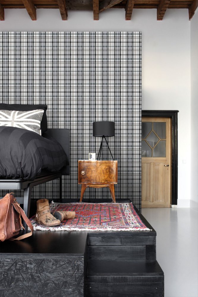 Vliestapete, Karomuster in Grautönen, Schwarz und Weiß.