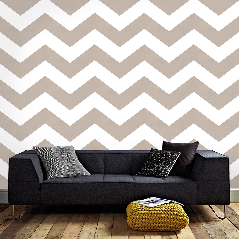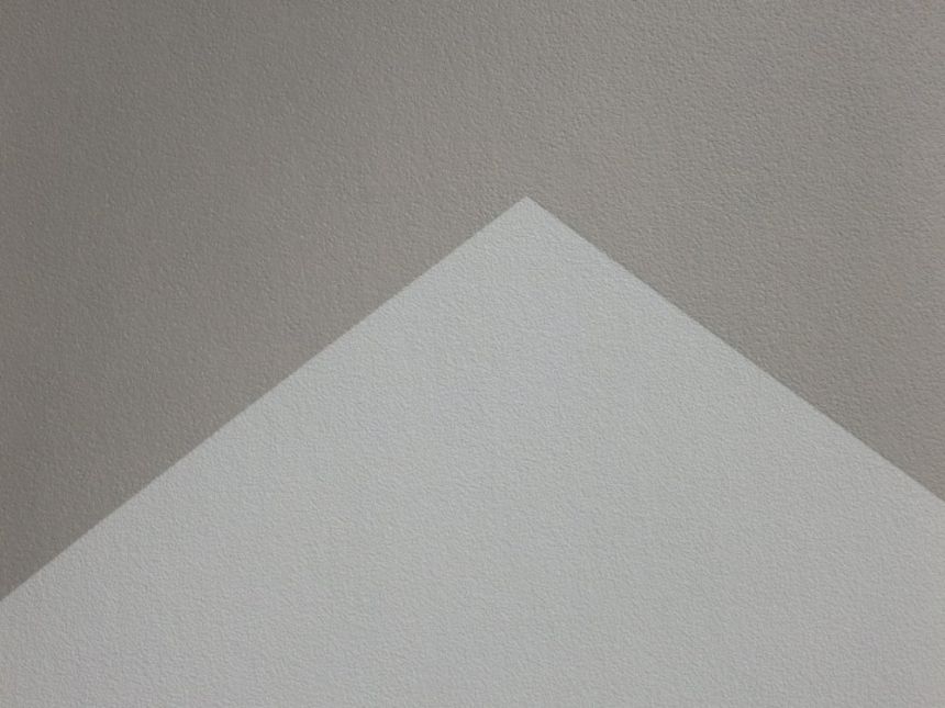 Modernes geometrisches Muster in grau-beigen Tönen auf weißer Vliesapete.