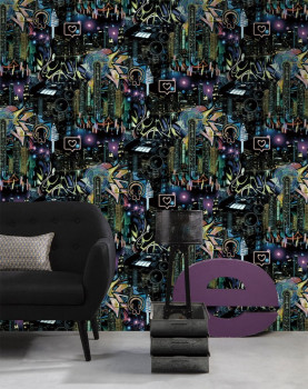 Tapete Glow in the Dark - Nachtstadt - Teile des Musters leuchten im Dunkeln.