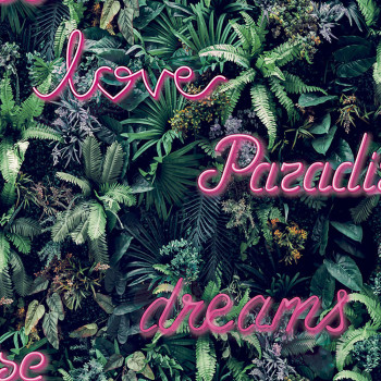 Vliestapete, tropische Blätter, pinke Neontexte.