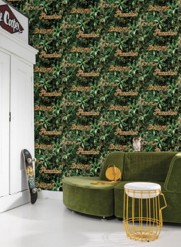Vliestapete mit tropischen Blättern, Neonschriftzug GV24210, Good Vibes, Decoprint