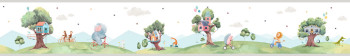 Fröhliche bunte selbstklebende Tapetenbordüre für Kinder mit Tieren in der Natur.