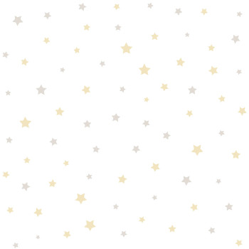 Weiße Papiertapete mit feiner Stoffstruktur, gelben und grauen Sternen.