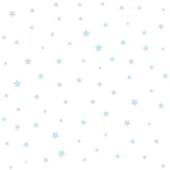 Weiße Papiertapete mit feiner Stoffstruktur, hellblauen und grauen Sternen.
