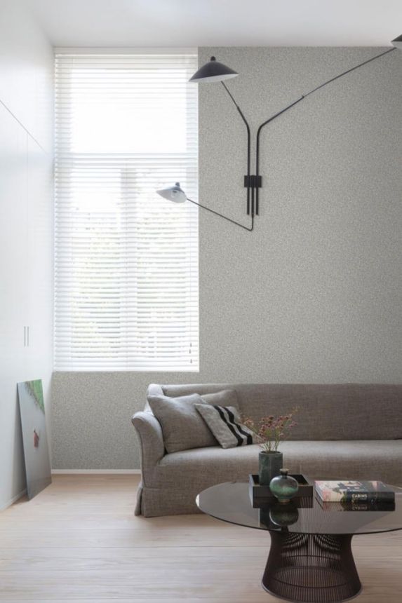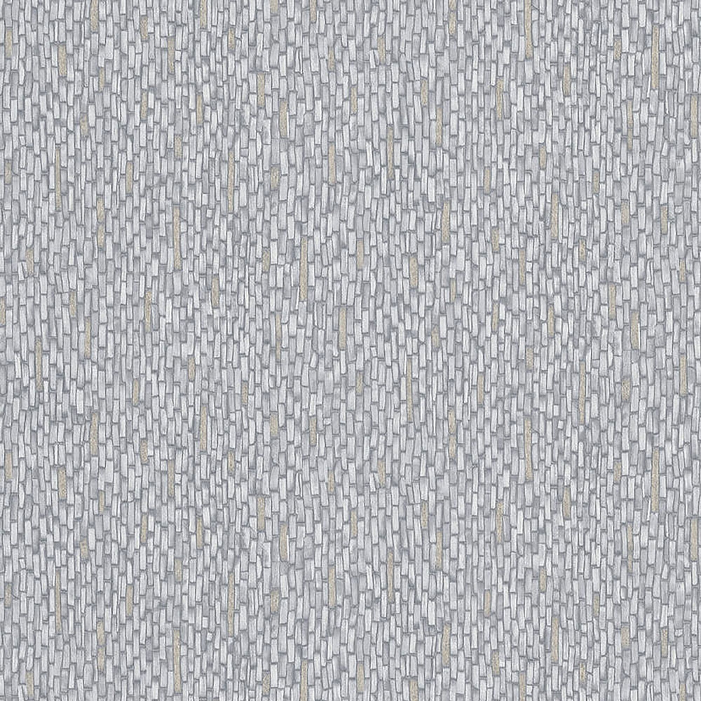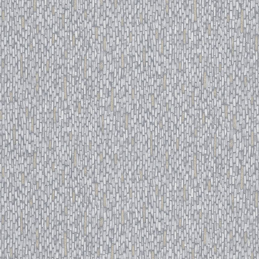 Vliestapete. Feinplastische Textur in Grautönen, goldbeige Details.