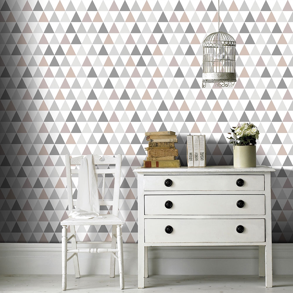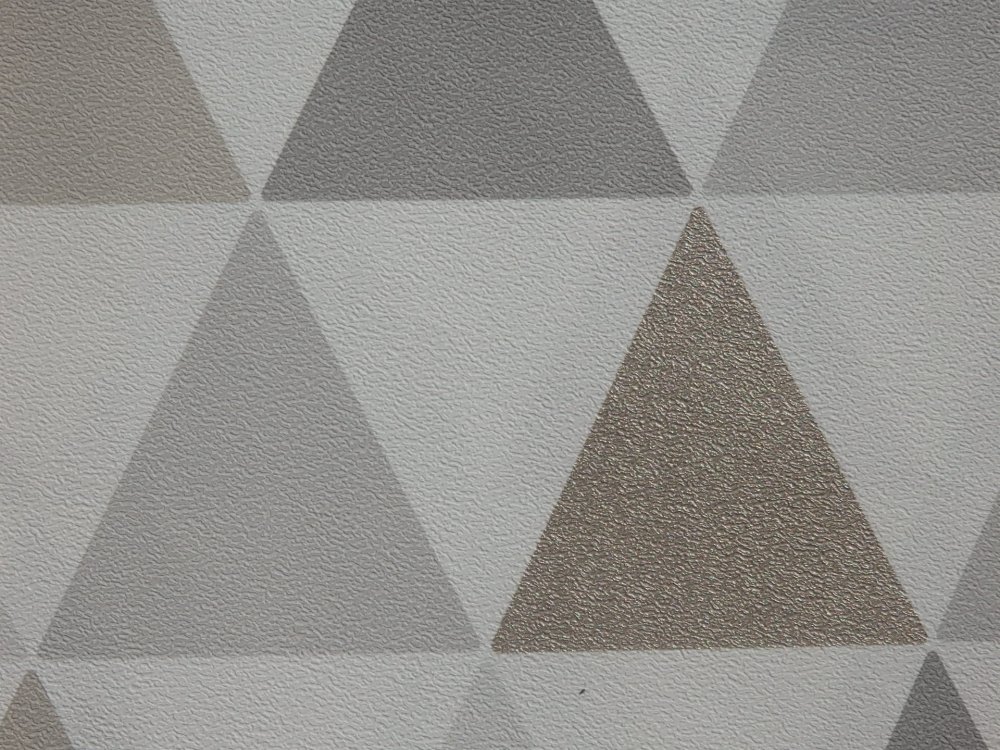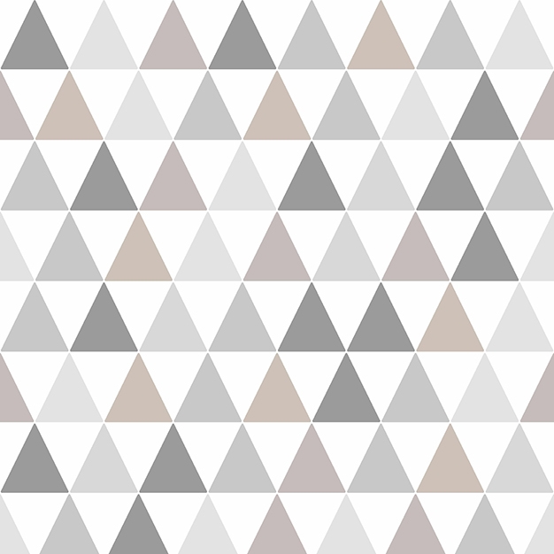 Modernes dreieckiges Mosaik in Grau- und Beigetönen auf weißer Vliestapete.