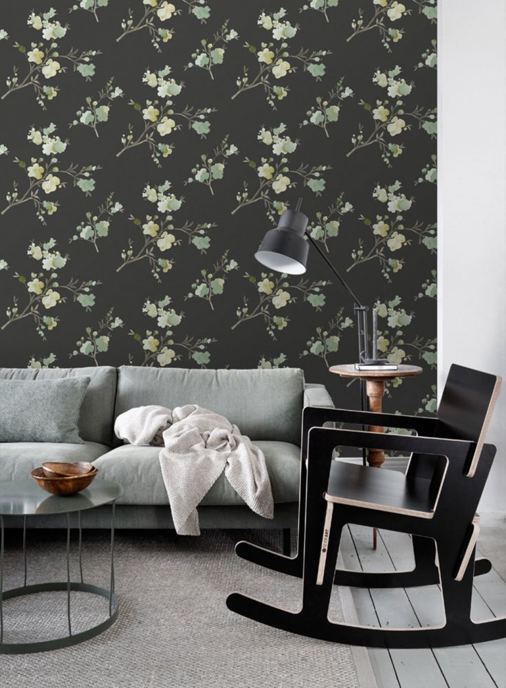 Schwarze Tapete, Motiv der Malerei blühender Zweige, die Tapete hat eine Stoffstruktur.