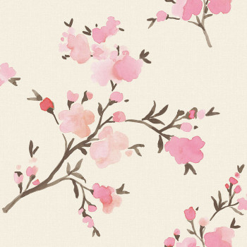 Cremefarbene Tapete, Motiv der Malerei blühender Zweige, die Tapete hat eine Stoffstruktur.