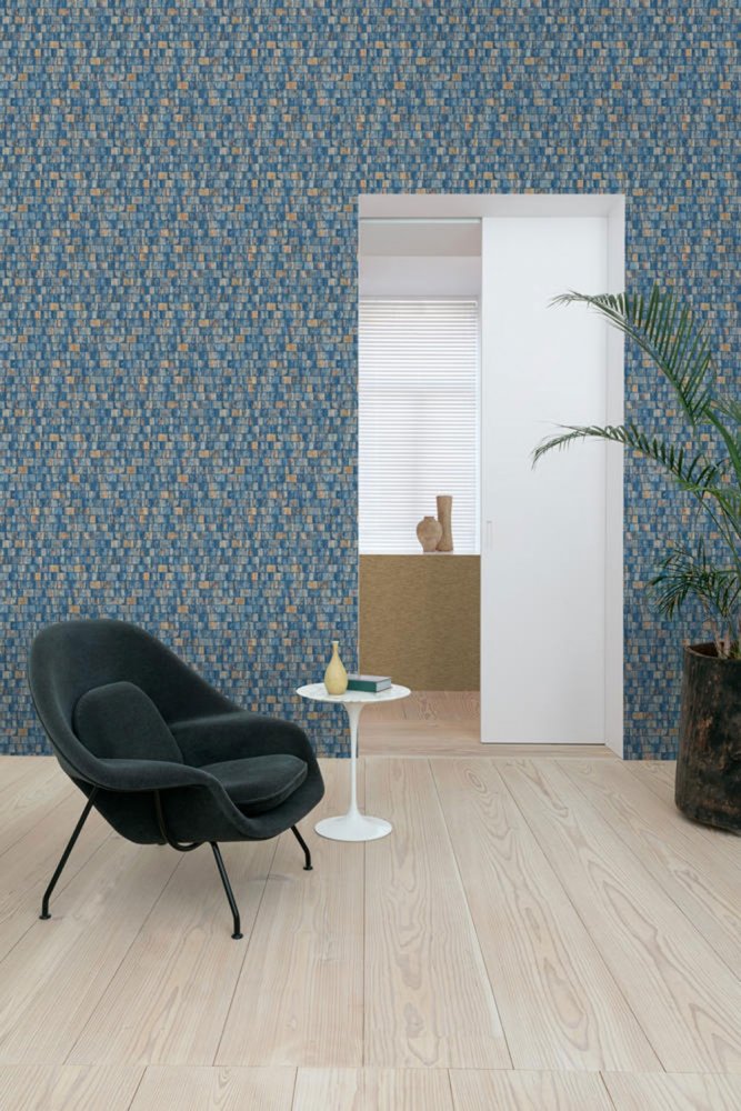 Feinstrukturierte Vliestapete - Fliesenimitat mit Metallic-Effekten.