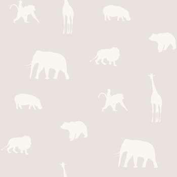 Kindertapete mit Tieren - grau-silberner Hintergrund, Tiere mit metallischem Perlglanz.