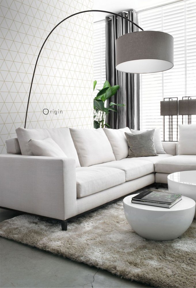 Weiße Tapete mit geometrischen mustern, goldene Linien bilden Dreiecke.