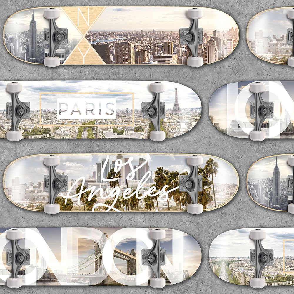 Rollenbreite 1,06 m Tapete mit Skateboards - Städte, Texte - Tapete für Teenager.