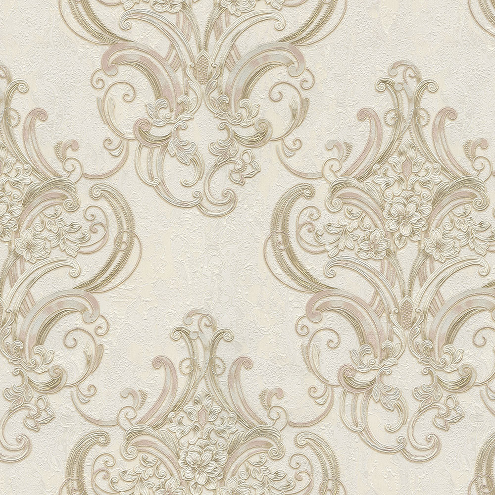 Cremig-beige-goldene Luxustapete mit einem markanten Ornamentmuster.